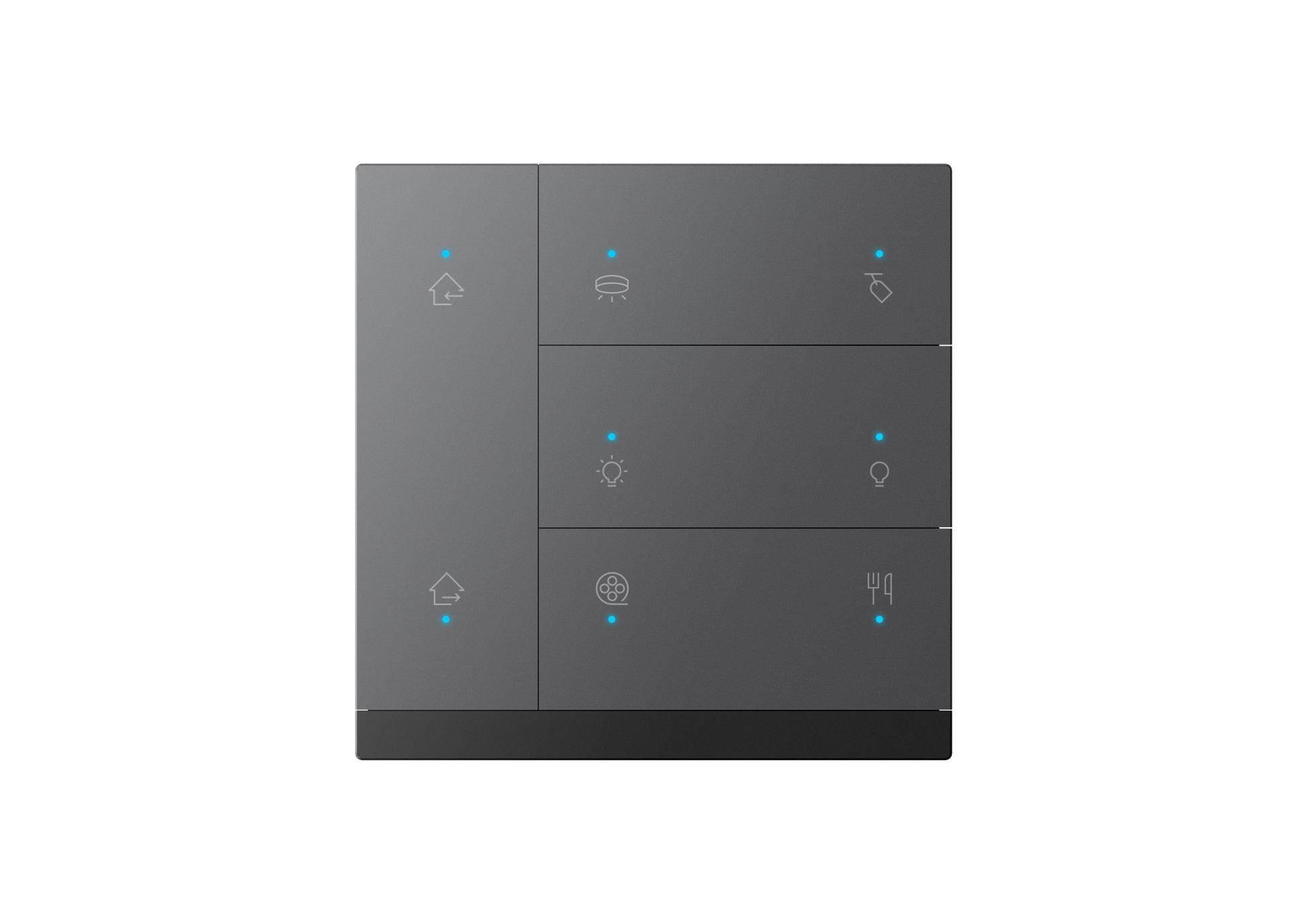 Replaceable mechanical metal/plastic buttons, built-in temperature sensor, 2-fold input (Binary or NTC), RGB color LED indicator.